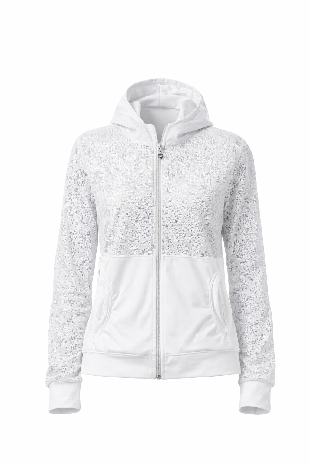 This beautiful jacket pairs effortlessly with any star-inspired pieces. The sheer sleeves feature subtle embedded glitter that adds shine without shedding—designed to stay flawless wash after wash. Crafted with UPF 50 protection throughout, it offers both style and performance, complete with a full zipper and functional pockets for everyday wear.